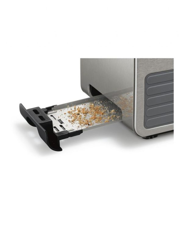 این توستر با ترکیب رنگهای مشکی و خاکستری و بدنهای از استیل ضدزنگ، ظاهری شیک و مدرن دارد که بهراحتی با دکوراسیونهای مختلف آشپزخانه هماهنگ میشود. ابعاد دستگاه ۱۸۴×۱۵۵×۲۹۲ میلیمتر است و وزن آن حدود ۲.۱ کیلوگرم میباشد. طراحی جمعوجور آن فضای زیادی را اشغال نمیکند و برای آشپزخانههای با فضای محدود نیز مناسب است.