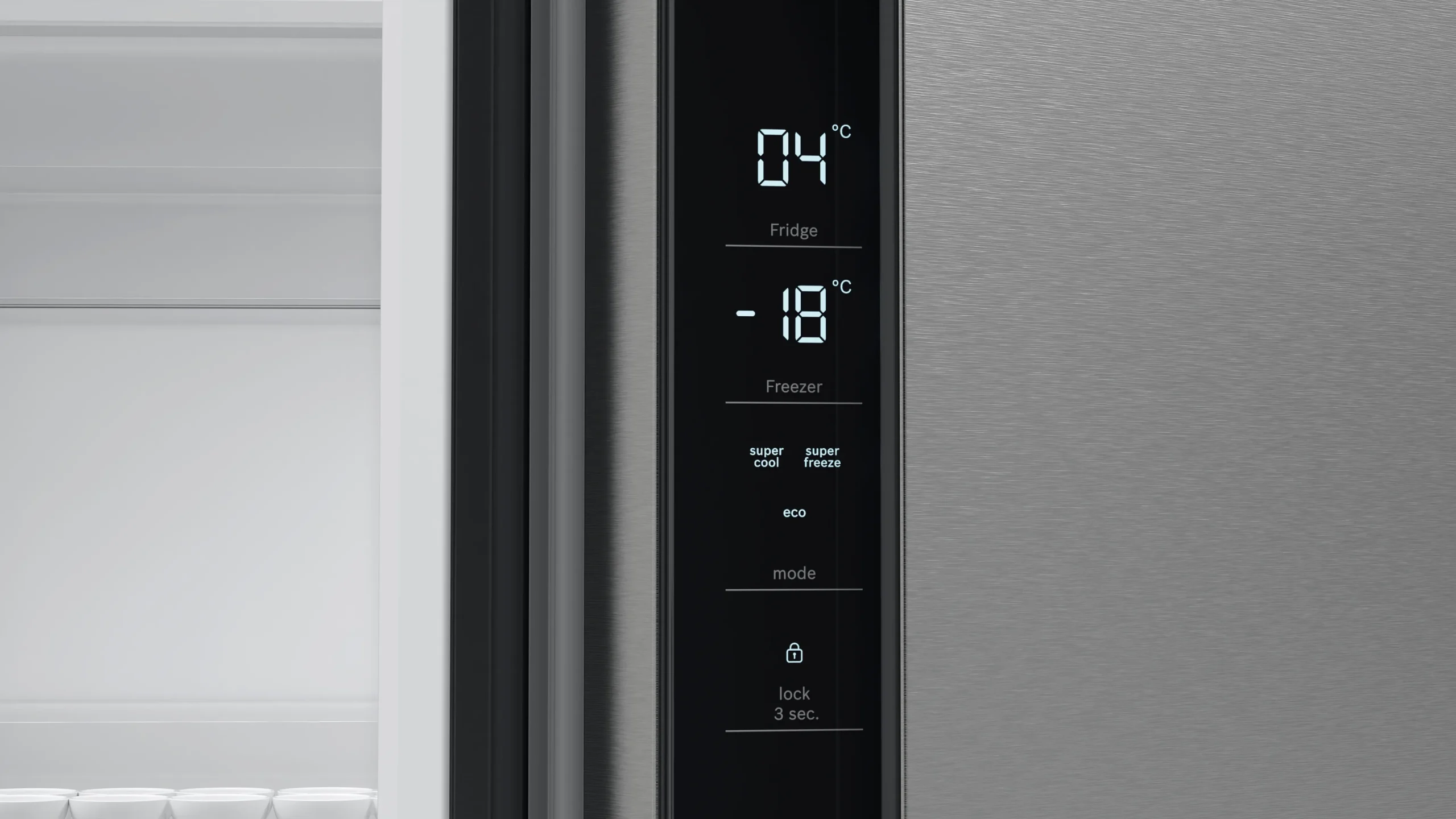 - با عملکرد Super Cooling که در این ساید سری 6 بوش به کار رفته می توانید قبل از خرید، دمای یخچال خود را برای مدت کوتاهی کاهش دهید. این تضمین می کند که خریدهای تازه شما در دمای مناسب نگه داشته می شود. فقط کافی است یک دکمه را فشار دهید تا دما را تا 2 درجه سانتی گراد در کمترین مقدار کاهش دهید و برای جلوگیری از مصرف برق، عملکرد به طور خودکار پس از تقریباً 6-15 ساعت به حالت اولیه برمی گردد.