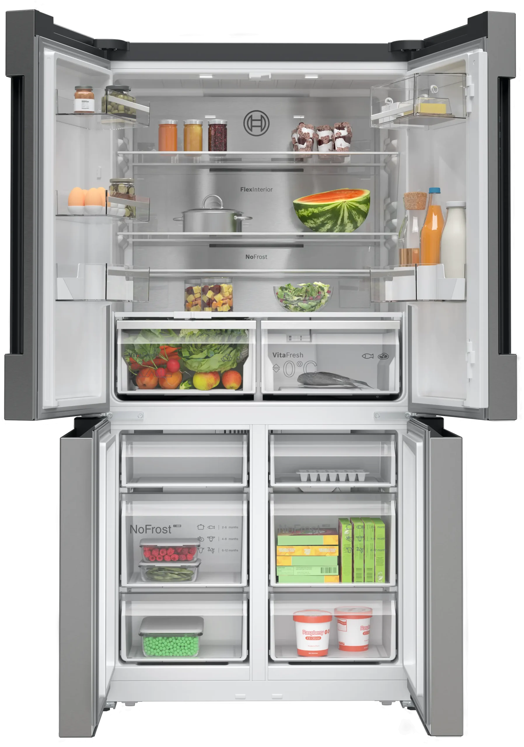 این یخچال نسبت به سایر سایدهای دیگر بوش دارای طراحی متفاوتی است و به صورت 4 درب می باشد. بخش یخچال در قسمت بالا قرار گرفته و دو درب آن به طرفین باز می شود و می توانید دسترسی خوبی به فضای داخلی آن داشته باشید و بخش مربوط به فریزر در پایین قرار دارد و درب های آن هم مانند یخچال به دو طرف باز می شود.
