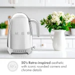 یکی از ویژگیهای برجسته کتری برقی درجه دار اسمگ رنگ نقره ای، طراحی منحصر به فرد آن است که الهامگرفته از دهه ۵۰ میلادی است. این طراحی کلاسیک با خطوط منحنی و جزئیات دقیق، بهطور طبیعی به هر آشپزخانهای زیبایی خاصی میبخشد.
